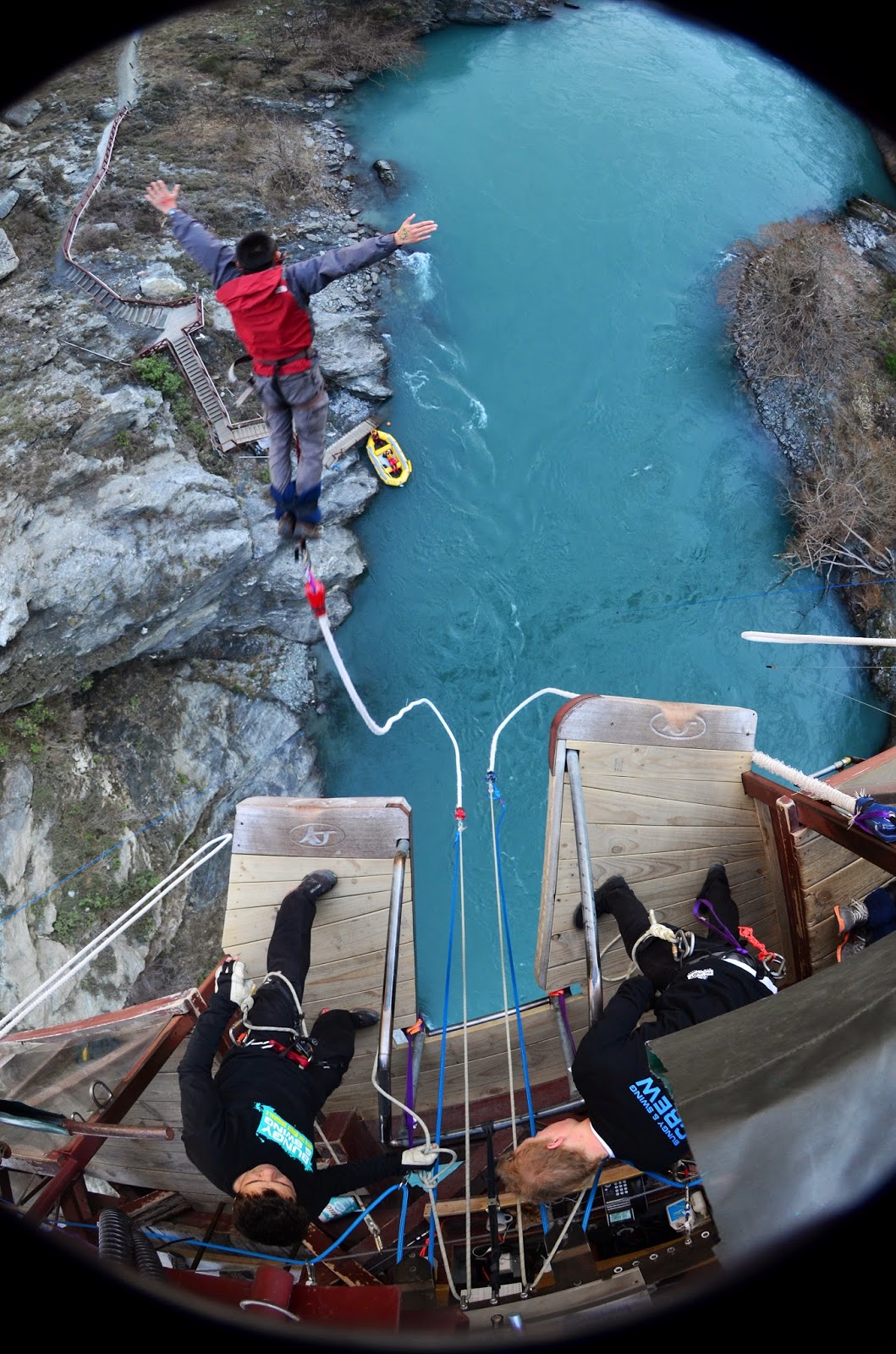 New Zealand is also where commercial bungee jumping was first pioneered. I ended up doing my first bungee jump at the original public jump at Kawarau bridge just outside Queenstown. The jump measures 43 meters off of a defunct bridge over a narrow river. I had thought after running of the bulls that I would never get that kind of adrenaline rush again, but jumping off of a bridge and falling within inches of the river below came pretty close to my time in Pamplona. The worst part was actually the waiting beforehand. Sitting on the bus and watching jumpers go before you, all that anxiety and fear just keep bouncing around and amplifying in your head. Once they got me strapped in and I was sitting near the ledge, I was surprised at how relatively calm I felt. Usually with my fear of heights, I get vertigo pretty badly near sharp ledges (wobbly legs and feeling faint are the usual symptoms), but walking to the edge before my jump, I just felt a lot of adrenaline and felt rather restless. The jump was really only scary for the first half-second or so in the initial moments of free-fall, but boy was that half-second scary! Afterwards we reveled in the afterglow of the remaining adrenaline in our veins as we downed a celebratory beer and emptied our wallets for the extremely overpriced (but very good quality) pictures.