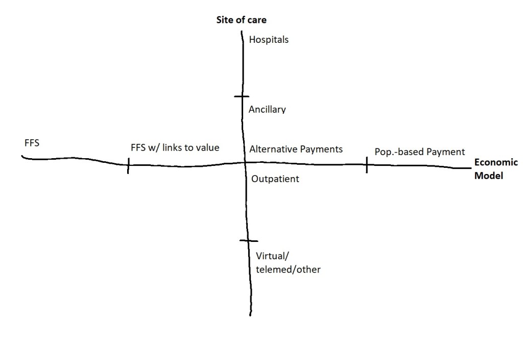 It’s hard to know where we’re going without knowing where we are today. I wanted to paint a mental picture for myself of the care delivery landscape, and I ended up with 12 archetypes of the major types of care delivery organizations (CDO’s) in America. I also wanted to use a simple framework to think about key differences between these organizations, and the role they each play in the ecosystem. To that end, I landed on two dimensions that I believe are the most relevant lens to think about change in this space: 1 – site of care, and 2 – the underlying economic model of CDO’s.